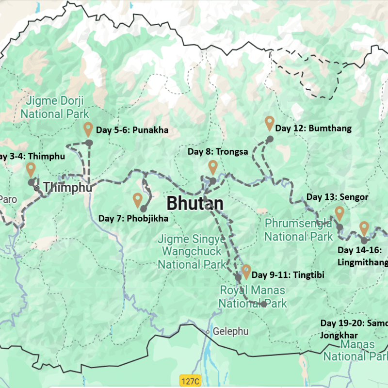 Starting in Paro in western Bhutan, the tour gradually makes its way eastward, passing through central and southern regions before concluding in the southeastern corner of the country. From there, guests can exit via the Indian state of Assam.