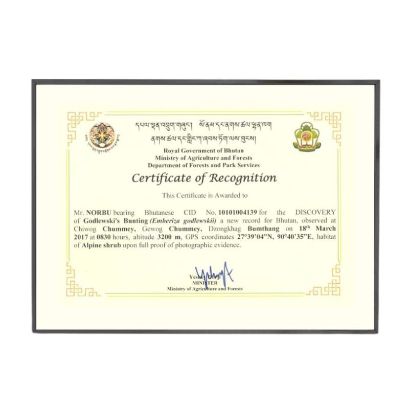 As an avid birdwatcher, he has spent many weeks traversing Bhutan, identifying prime locations to observe the most coveted bird species, such as the elusive Wren Babblers, Pheasants, Trogons, and other notable species found in Bhutan. His explorations have contributed to expanding the knowledge of many species that were previously poorly documented.. Norbu has also been a pioneer among local birding guides, as he was one of the first to lead international birding tours independently. Norbu has also collaborated with Tom Stephenson, his birding colleague and co-author of The Warbler Guide, to conduct extensive recordings of Bhutan’s bird songs. They have amassed a vast library of local bird songs, which Norbu has generously shared with Cornell University’s Macaulay Library and the public site, Xeno-canto.