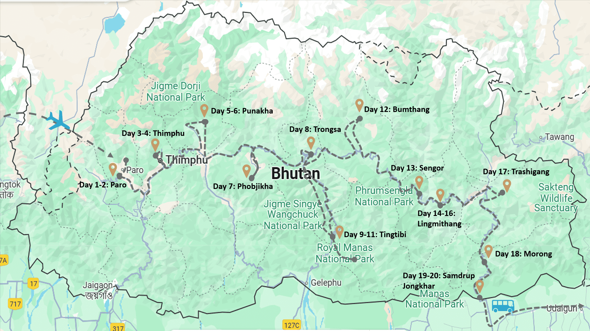 Starting in Paro in western Bhutan, the tour gradually makes its way eastward, passing through central and southern regions before concluding in the southeastern corner of the country. From there, guests can exit via the Indian state of Assam.